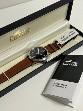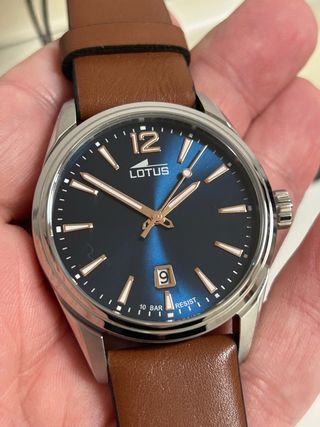 Elegante reloj Lotus con esfera azul y correa de cuero marrón. - Caja de acero inoxidable. - Esfera azul. - Correa de cuero marrón. - Indicador de fecha. - Resistencia al agua de 10 BAR. - Incluye caja original y garantía. - 100% original.