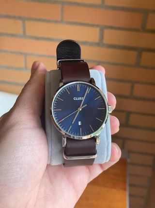 Elegante reloj Cluse con correa de cuero. No ha sido utilizado, tiene el plástico en la parte de la batería, requiere cambio de pila. - Esfera de color azul. - Correa de cuero marrón.