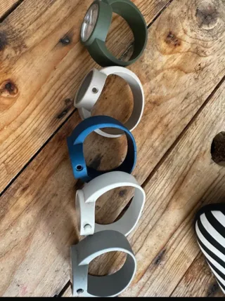 Conjunto de cinco relojes O'Clock con correas intercambiables. - Correa de color verde. - Correa de color blanco. - Correa de color azul. - Correa de color gris. - Correa de color blanco.