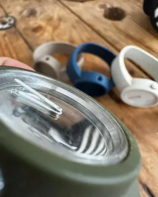 Correa de tela elástica para reloj con un diseño moderno y cómodo. - Combinación de colores gris y azul. - Cierre de velcro ajustable.