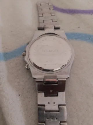 Reloj de pulsera con esfera azul y detalles plateados. - Diseño moderno y funcional. - Correa de eslabones metálicos. La pila se ha agotado, por lo demas funciona bien ,hasta hace dias sonaba la alarma que tenia puesta