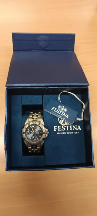 Elegante reloj Festina (Modelo F16974) en impecables condiciones. Destaca por su profunda esfera azul con textura de "guilloché" y detalles en oro rosa/plateado. * Movimiento: Cuarzo japonés de alta precisión. * Funciones: Calendario completo (día de la semana, día del mes y formato 24 horas) en subesferas. * Caja: Acero inoxidable de 41mm (tamaño ideal para cualquier muñeca). * Correa: Piel original Festina en color azul marino con grabado de cocodrilo. Resistencia al agua: 3 ATM (30 metros). *Estado: Usado una vez. Está impecable y la caja no presenta arañazos visibles. Se entrega con caja y garantía