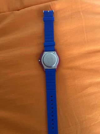 Reloj Casio con correa negra y reborde color lavanda en esfera cuadrada (aunque suene contradictorio: oxímoron) Indica hora, minutos, segundos, día de la semana y del mes, mes y año. Con pila funcionando. Parte de la correa de la hebilla rota. Solo el reloj: 14 euros. Con correa de recambio, 17 euros. No hago envíos. Recogida en mi domicilio de Alicante - Correa de caucho negra. - Caja de resina azul. - Pantalla digital.