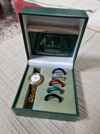 Conjunto de reloj Gucci con caja dorada y esfera blanca. Incluye varios biseles de colores para personalizar el reloj. Modelo 11/12.2 - Biseles de colores: azul, plateado, rojo, verde y negro. - Correa dorada estilo eslabones.