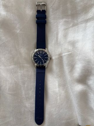 Correa de caucho. Fluoroelastomero de extrema calidad. Nada que ver con la silicona. Observa el grosor de la correa y la calidad de la hebilla de acero. Fabricada en material FKM. A estrenar. OJO: Tiene un pequeño defecto en el interior (de 1mm) que no le afecta en nada (mira las fotos). Calidad exacta a Crafter Blue. Perfecta para Seiko, Tag Heuer, Suunto, Garmin... - Material: FKM - Ancho: 22mm - Color: Navy