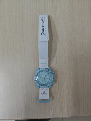 Reloj Omega x Swatch, modelo Mission to Uranus. - Correa de velcro blanca y azul. - Esfera con detalles en azul claro. - Diseño inspirado en la misión espacial.