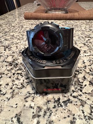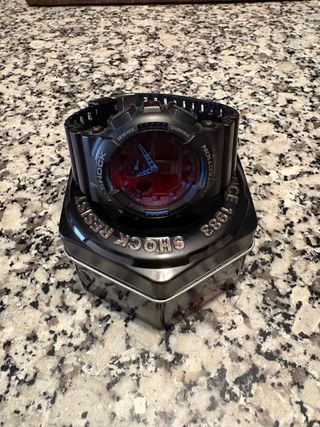 Reloj Casio G-Shock con un diseño deportivo y resistente. - Esfera con detalles en rojo y azul. - Correa de resina negra. - Caja metálica de presentación con Shock Resist y Since 1983.
