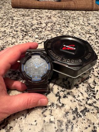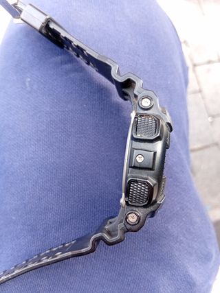 Reloj deportivo Casio G-Shock con un diseño robusto y llamativo. - Esfera con detalles en azul. - Correa negra. - Resistencia a golpes (Shock Resist). - Resistencia al agua WR20BAR.