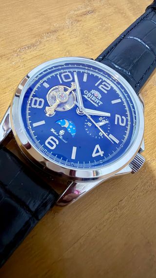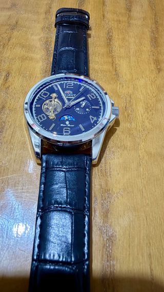 Elegante reloj Orient automático con una esfera azul y detalles plateados. Su diseño combina estilo y funcionalidad. - Correa de cuero negra. - Bisel plateado. - Indicadores horarios plateados. - movimiento automático sin pilas - Indicador día/noche. - No tengo la caja, solo el reloj, pero esta nuevo sin uso. - Puede obtener un descuento.