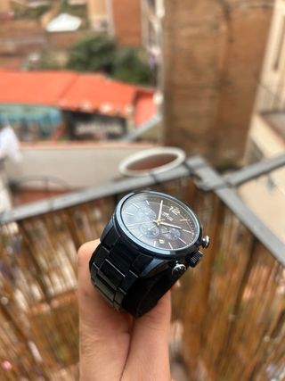 Reloj de pulsera con un diseño moderno y llamativo. - Correa de eslabones en color negro. - Bisel con detalles en azul. - Esfera con múltiples indicadores.