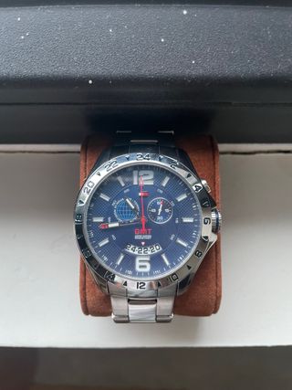 Reloj deportivo Modaiya en color negro y plata. Está en perfecto estado. - Correa y caja de acero inoxidable. - Esfera negra con detalles en rojo y azul. - Movimiento de cuarzo. Nuevo sin usar . Lo vendo por que no me conbina bien el color azul y rojo con un traje. Tiene pilas esta en funcionamiento Vendo o cambio por reloj de hombre con correa en caucho o piel
