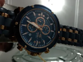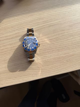 Elegante reloj automático de caballero con un diseño llamativo. - Bisel giratorio azul y dorado. - Correa de acero inoxidable con detalles dorados. - Esfera azul con marcadores luminosos. - Mecanismo Seiko NH35 - Utilizado solamente un dia.