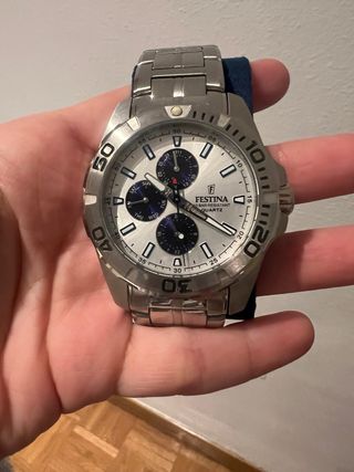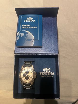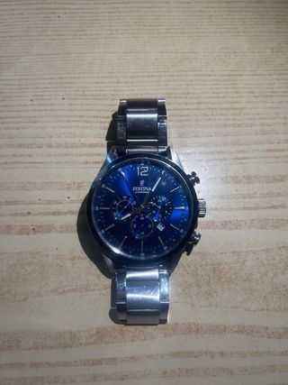 OFERTA ABIERTA (ESCRIBIDME) Vendo reloj Festina Chronograph original con esfera azul y correa de acero inoxidable. 🔹 Marca: Festina 🔹 Modelo: Chronograph 🔹 Caja: Acero inoxidable (Stainless Steel Case) 🔹 Correa: Acero inoxidable original Festina 🔹 Esfera: Azul con efecto degradado 🔹 Funciones: Cronógrafo, calendario (fecha visible a las 4-5), segundero, subesferas funcionales 🔹 Cierre: Desplegable con logo Festina El reloj funciona correctamente. Presenta marcas normales de uso en la correa y la parte trasera (ver fotos), propias del uso diario, pero nada que afecte a su funcionamiento. Cristal en buen estado.