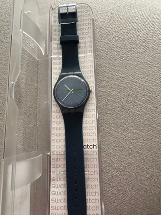 Reloj Swatch en su caja original, sin usar. - Diseño moderno con detalles en verde. - Correa azul marino. - Caja transparente de Swatch. Habría que cambiarle la pila únicamente.