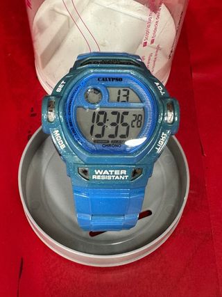 Reloj digital Calypso con un diseño moderno y llamativo. Es resistente al agua. - Correa de goma. - Pantalla digital. - Funciones de cronógrafo y alarma.