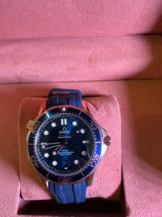 Reloj Ome Seamaster Professional con esfera azul y detalles dorados. - Bisel giratorio. - Correa de caucho azul. - Resistencia al agua de 300m/1000ft.