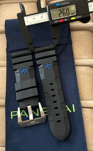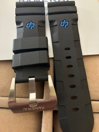 Correa de repuesto para reloj Panerai. - Hebilla de acero inoxidable con logo. - Diseño deportivo y moderno. - Modelo submersible, caucho negro 26/22 STD - Ancho de banda (asas) 26mm - Logo en azul marcado “OP”