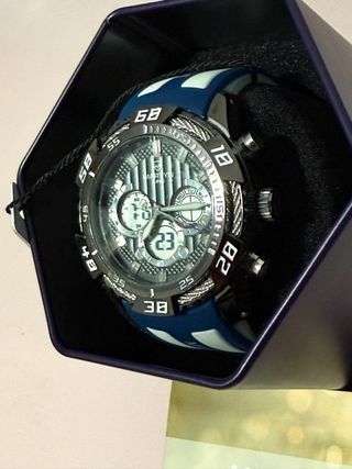 Reloj de pulsera con un diseño deportivo y moderno. - Esfera azul con detalles en blanco y rojo. - Correa de material sintético en color azul. - Da la hora,minutos y segundos. Cronógrafo solo decorativo.