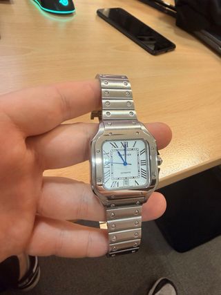 Elegante reloj Cartier Santos con detalles plateados y esfera blanca acabados de aguja y corona azules y numeros romanos. Se ofrece la posibilidad de venta con caja. 50 euros mas. - Diseño cuadrado. - Correa de eslabones. - Indicador de fecha exacta. Precio negociable