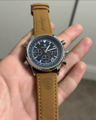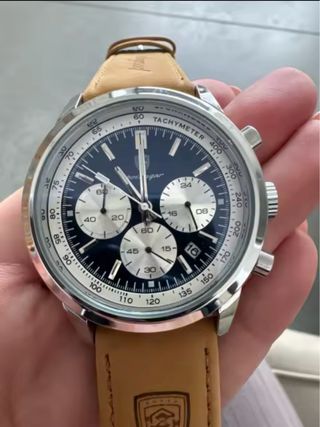 Elegante reloj para hombre con una esfera azul y detalles en marrón. - Correa de cuero marrón. - Esfera azul con detalles plateados. - Diseño con múltiples subesferas.