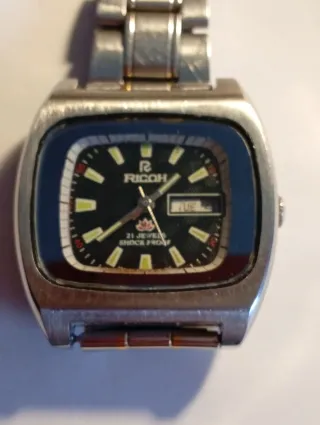 Reloj de pulsera Ricoh con esfera de color azul y detalles plateados. Funcionando. Mide 38 mm. - Diseño analógico. - Correa de eslabones plateada. - Indicador de día de la semana.