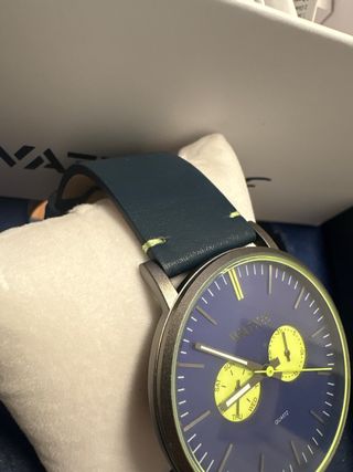 Reloj de pulsera con diseño moderno y elegante. - Esfera negra con detalles en verde. - Correa de piel azul. - Indicadores de día y fecha.