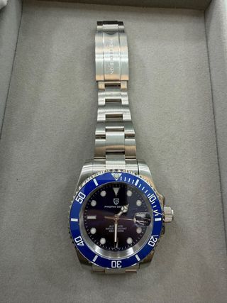 Reloj de la marca Pagani Design con una combinación de colores azul y negro. - Caja y correa en tonos negros. - Bisel y detalles en azul. - Incluye tarjeta de garantía y manual de usuario.