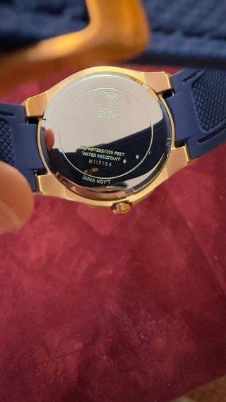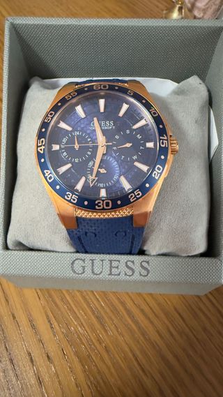 Elegante reloj Guess para caballero con un diseño moderno y atractivo. - Esfera azul con detalles dorados. - Correa de silicona azul. - Bisel con marcadores dorados y azules. Una sola puesta, precio negociable siendo REALISTAS