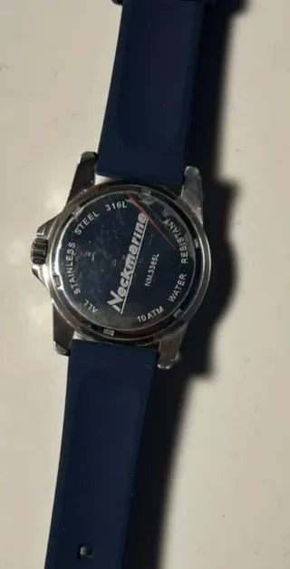 Reloj de pulsera con correa de silicona azul y detalles plateados. - Esfera azul con marcadores horarios plateados. - Bisel giratorio azul. - Correa de silicona azul con el logo de Neckmarine. - Cierre de hebilla plateado.