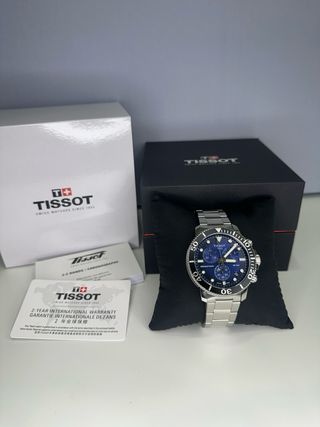 Reloj Tissot Seastar 1000 con cronógrafo. Presenta una esfera azul y detalles en negro. - Caja de 45.5mm. - Bisel giratorio. - Correa de acero inoxidable. - Incluye caja original y garantía internacional de 2 años.