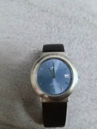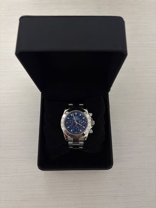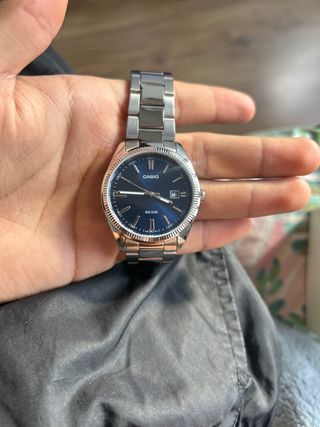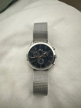 Reloj Lotus con esfera azul y detalles plateados. - Diseño deportivo y elegante. - Bisel giratorio. - Correa de metal. - Resistente al agua 100M. Lo único q no funciona es el día q no cambia. tengo eslabones sueltos por si necesitas ponértelo más grande