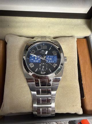 Reloj de pulsera Lotus con diseño deportivo y elegante. - No lleva ningún rastro de desperfecto tanto a nivel exterior como funcional. - Esfera azul con detalles plateados. - Correa de metal plateado. - Múltiples funciones visibles en la esfera. - Precio NEGOCIABLE