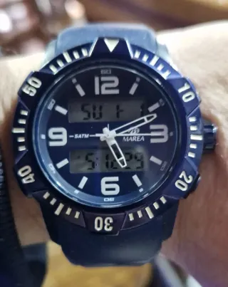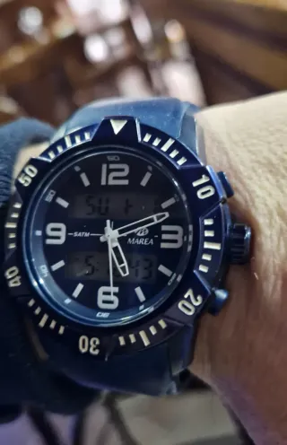 Reloj Marea con un diseño moderno y atractivo. - Bisel con detalles en plateado. - Correa de goma azul. - Esfera con indicadores analógicos y digitales.