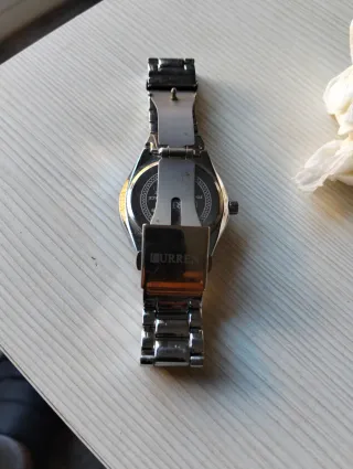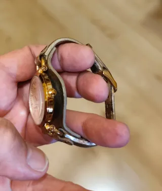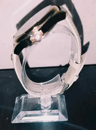 Elegante reloj de pulsera con correa. - Esfera redonda. - Correa de piel sintética. - Detalles en tono dorado. La correa esta un poco dañada como se puede ver en la ultima foro