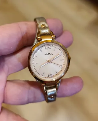 Reloj Fossil 100 % original, en muy buen estado y funcionando perfectamente. Modelo femenino con un diseño elegante, limpio y atemporal, ideal tanto para uso diario como para ocasiones más formales. Características: ✔️ Movimiento cuarzo ✔️ Caja dorada (acabado PVD) ✔️ Esfera clara minimalista, muy legible ✔️ Pulsera original Fossil, muy característica y poco habitual, difícil de encontrar en este estado ✔️ Cómodo, ligero, bien proporcionado y cuidado. La pulsera original marca la diferencia frente a otros modelos similares con correa genérica. 🔍 VISITA MI PERFIL PARA VER MÁS RELOJES INTERESANTES.