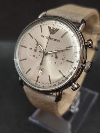 Reloj Emporio Armani AR11107 para hombre, reloj diseño aviator deportivo–elegante, caja de acero inoxidable de 43 mm, esfera en tonos neutros y correa de piel. ⏱️ Movimiento: Cuarzo cronógrafo (24 h y fecha) 🛡️ Caja: Acero inoxidable 🔗 Correa: Piel 🔍 Cristal: Mineral 💧 Resistencia al agua: 5 ATM / 50 m 📏 Diámetro de caja: 43 mm ✔️ Reloj para hombre en oferta, nuevo, original y sin estrenar 📦 Incluye: caja original, documentación y etiquetas 🧾 Factura con IVA 🛡️ 3 años de garantía legal ⭐ Más de 750 envíos mediante wallapop. Consultenos sin ningún compromiso para cualquier información adicional.