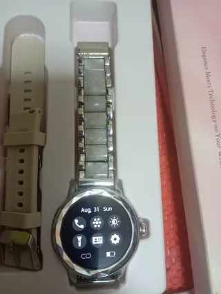 Elegante reloj inteligente de mujer con correa de silicona color beige/rosado, contiene otra correa de malla metálica de oro rosa, este dispositivo sincroniza con tu móvil por Bluetooth, realizando diversas funciones, actividad deportiva, sueño, tensión sanguínea, etc etc - Pantalla táctil a color, con elección pantalla - Diseño moderno y ligero. - Correa ajustable. - Está en su caja original con instrucciones y cables para carga