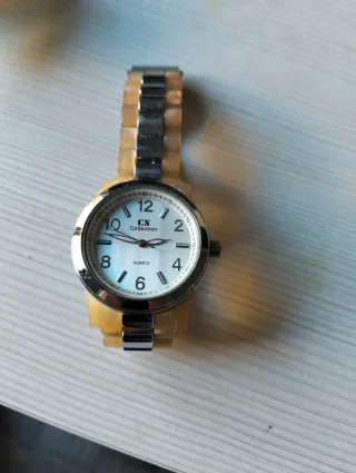 Elegante reloj de la marca CS Collection con un diseño moderno. - Correa combinada en tonos beige y plateado. - Esfera clara con marcadores de hora.