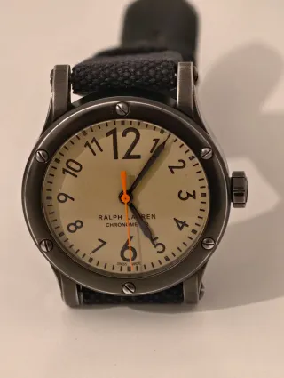Reloj Ralph Lauren modelo Safari RL67 con movimiento automático, esfera de acero inoxidable de 39mm. - Esfera beige. - Correa negra. - Bisel con tornillos. - Indicadores horarios numéricos. Está como nuevo y regalo dos correas de repuesto.