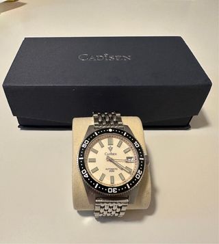 Reloj de pulsera Cadisen con un diseño elegante y funcional. 38 mm de esfera. Se vende con 2 correas (18mm): - Correa de eslabones tipo ‘granos de arroz’ de gran calidad, comprada en esprit nato, con todos sus eslabones. - Correa de caucho negra. - Como nuevo, no se ha utilizado. - Movimiento NH35 automático - Esfera de color beige. - Bisel giratorio negro. - Resistencia al agua de 200m