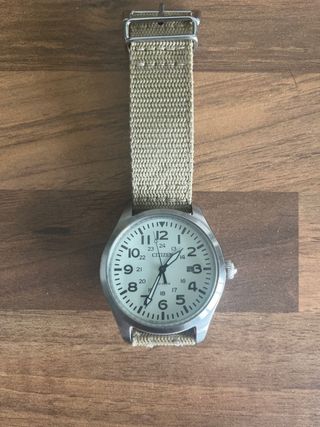 Reloj Citizen con correa de tela beige y detalles plateados. Un accesorio versátil y funcional. - Correa de tela resistente. - Caja de metal plateado. De 42mm alto 10,5 acero inoxidable +correa de regalo nueva
