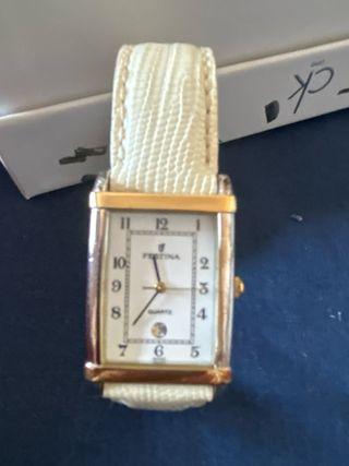 Elegante reloj Festina con diseño rectangular y correa en tono beige. - Caja dorada. - Esfera blanca con detalles en negro. - Correa con textura de lagarto.