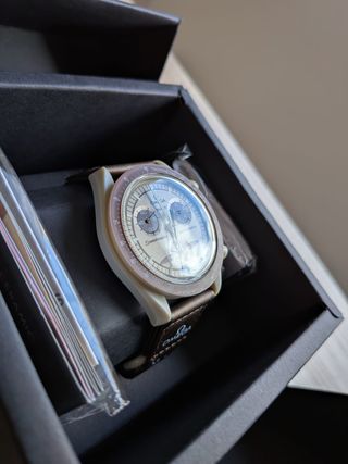 Reloj de la colaboración entre Omega y Swatch. - Esfera de color marrón. - Correa de color beige. - Diseño inspirado en el espacio. - Artículo nuevo sin caja