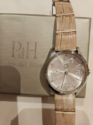 Elegante reloj de la marca Pedro del Hierro con un diseño sofisticado. - Correa de piel con textura. - Esfera plateada con detalles. - Caja de metal.