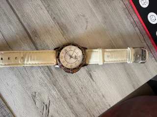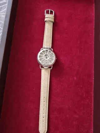 Elegante reloj de pulsera con correa beige y detalles dorados. - Esfera blanca con números romanos. - Bisel adornado con pequeñas piedras brillantes. - Correa de piel con cierre de hebilla. El precio de venta nuevo es superior a 200 €. Le falta una piedrecita del bisel, no es dificil ni caro encontrarlas.