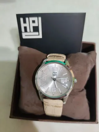 Elegante reloj HPI con correa. - Esfera plateada con detalles. - Correa de piel sintética en tono beige.
