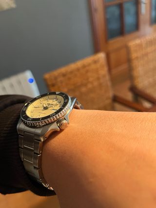 Reloj Seiko 5 Sport con esfera beige y detalles plateados. con garantía de 2 años ... - Sin uso. - Bisel giratorio negro. - Correa de acero inoxidable. - Ventana de día y fecha.