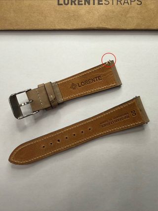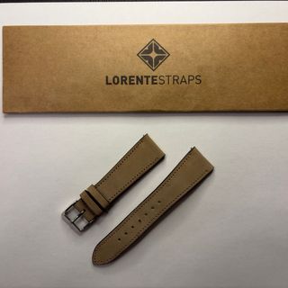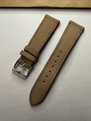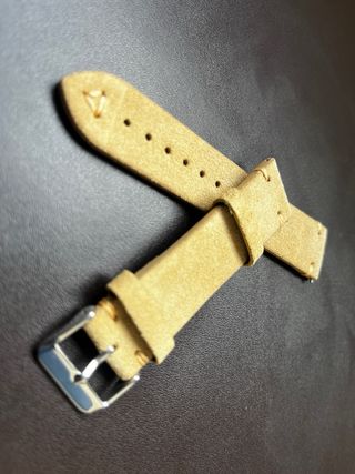 Correa de nobuk en color beige, con un ancho de 20 mm. Tiene un pequeño despunte en la costura, señalado en las fotos, pero con fácil arreglo. - Hebilla de acero. - Pasadores incluidos. - Cuero vacuno curtido vegetal de alta calidad. - Longitud de 110 mm/70 mm.