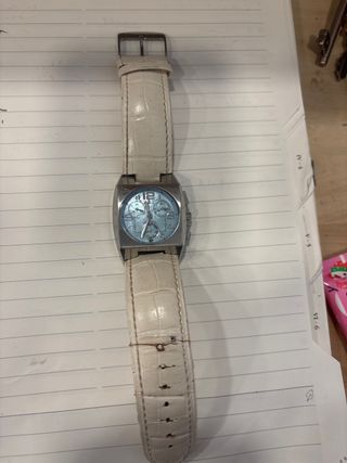 Reloj Timberland original para hombre en buen estado. • Caja de acero inoxidable • Grabado en trasera: “5 ATM Water Resistant” • Correa de piel marrón original Timberland • Esfera beige con numeración grande • Subesfera día de la semana • Subesfera fecha • Bisel formato 24h Estilo casual / outdoor muy característico de la marca. La correa presenta marcas normales de uso (ver fotos). Funciona correctamente. Se vende tal cual aparece en las imágenes. Acepto ofertas.