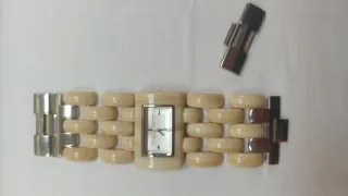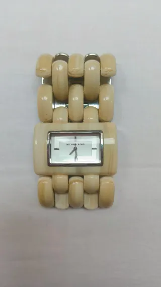 Reloj Michael Kors modelo MK4261, conocido como el reloj Rio Alabaster. Este reloj de cuarzo destaca por su diseño de pulsera ancha con un acabado de acetato con efecto marmorizado en tonos beige y crema. Detalles del Reloj: - Modelo: Michael Kors MK4261. - Material: Caja y correa fabricadas en acetato beige de alta calidad, con detalles de herrajes en tono plateado. - Caja: Forma rectangular con una esfera blanca y cristal mineral. - Dimensiones: La caja mide aprox. 21x33 mm y la correa tiene un ancho de unos 47 mm. En perfecto estado. Sin arañazos ni desgastes. Se vende con su caja original y pieza para alargar la correa.